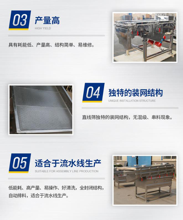 篩機(jī)篩面由不同傾角的多區(qū)段(一般為三段)組成,使篩分物料在各區(qū)段呈近似等厚分布,有利于物料在篩面上的輸送、分層和透篩。該系列篩機(jī)與其他直線篩相比具有更高的篩分效率和單位設(shè)備重量處理量大及篩面磨損小,不易堵孔等特點。