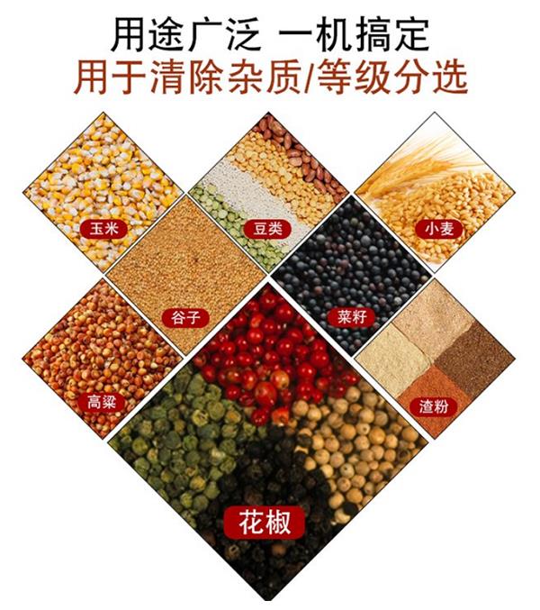本機(jī)為二層篩網(wǎng),先經(jīng)過進(jìn)料口處風(fēng)機(jī)吹風(fēng),直接吹走重量輕的雜質(zhì)或糠殼廢秸稈.上層篩網(wǎng)的初次篩選把大雜清理過,好的糧食(種子)直接落到下層篩網(wǎng)上,下層篩網(wǎng)會把糧食顆粒(種子)中的小雜.小石子.有缺陷的癟籽直接漏掉,完好的糧食(種子)會從出料口篩分凈選出來。整機(jī)采用離心軸的篩分原理,工作時(shí)物料上下?lián)u擺,通過風(fēng)選和震動把好的物料精選出料.